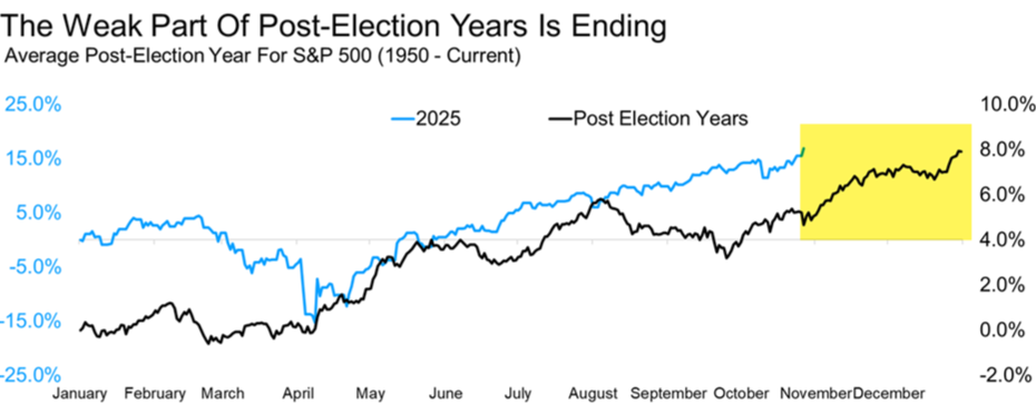 This seasonality is reinforced by historical averages and medians, where markets frequently show near double the returns in November and December compared to other times of the year, as highlighted in the table below. Additionally, statistical evidence suggests that when markets have posted gains leading into October, this momentum carries through the year-end period with even stronger performance. This is especially notable in post-election years, which traditionally experience a volatility dip earlier in the year followed by sustained gains as confidence rebuilds, as shown in the last chart.