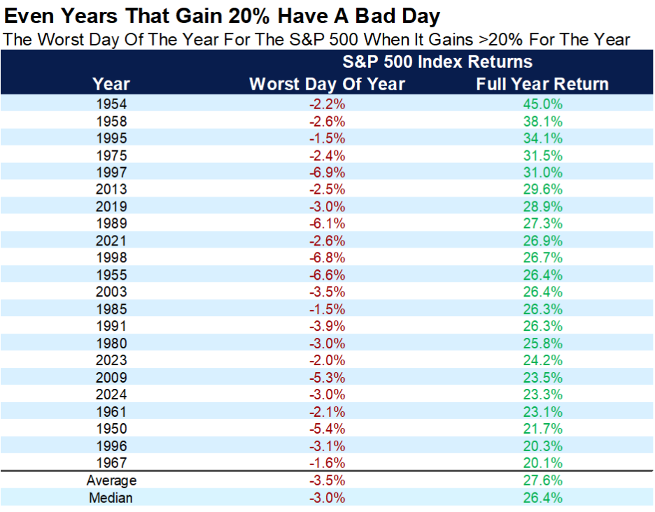 Further analysis shows that the worst market days typically occur near the best days, which means selling during downturns often results in missing out on subsequent rallies. For instance, the significant two-day selloff after Liberation Day in 2025 was quickly followed by one of the best two-day rallies. This is supported by the table below listing years when the S&P 500 gained 20% or more but still had severe down days, such as 1997, when the market dropped nearly 7% on its worst day but ended the year with a 30.9% gain. This reinforces the advice for investors to expect volatility and stay the course without panicking.