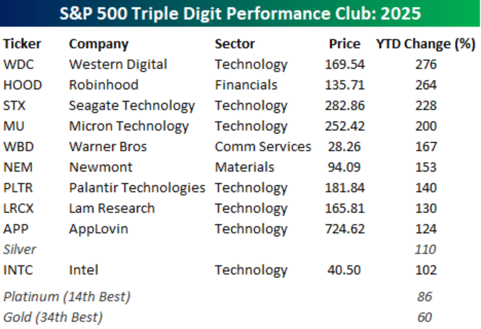 This year (as of Wednesday, December 10th), gold rose about 60%, platinum advanced roughly 86%, and silver surged by approximately 110% as this chart below highlights, putting these metals in the same conversation as the strongest individual stocks in major equity indices. Such moves compress extraordinary capital appreciation into a short window, challenging the notion that investors must always look to growth companies for outsized returns.