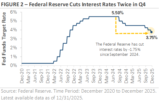 The Federal Reserve (Fed) continued its rate-cutting cycle in Q4, but policymakers delivered a more nuanced message than simply lowering rates and offering forward guidance. Figure 2 below shows the Fed has cut interest rates by a total of 1.75% since starting its rate-cutting cycle in September 2024. Two of those cuts came in Q4, with 0.25% reductions at the October and December meetings. However, the messaging behind the two cuts changed. Officials have grown more cautious and divided, with several voting members favoring either no cut or a larger cut, and they’ve emphasized that future rate cuts will depend on incoming data.