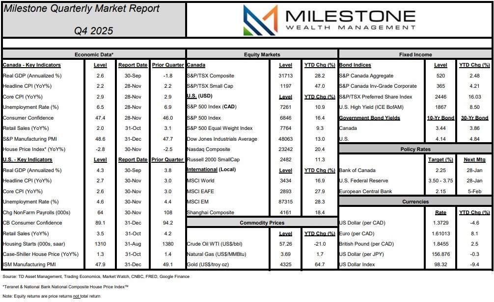 Here is our Milestone Quarterly Market Report on economic data, capital markets, commodities, and currencies through September 30th, 2025: *Click here for PDF version*