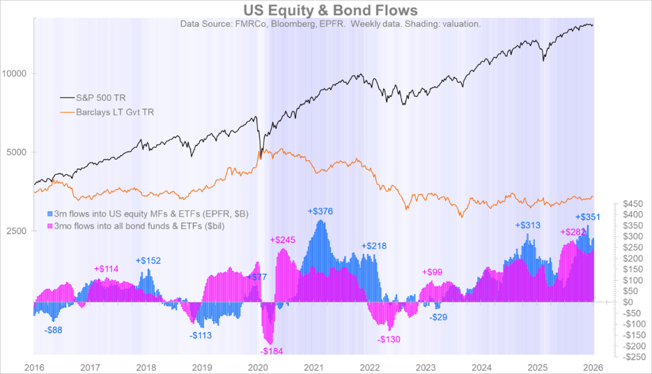 Money flow data also seems to reinforce the idea that this is a broad, durable cycle rather than a narrow, late stage blowoff. In the next chart of U.S. equity and bond fund flows, multi-year episodes of large net inflows into both risk assets and fixed income sit alongside rising total returns for equity indices and long-term government bonds, implying that long horizon investors remain comfortable adding exposure across the capital structure. The sequence of annual flow bars—swinging from sizable outflows in years of stress to record inflows more recently—underscores how repositioning has moved from de-risking to re-risking as macro uncertainty has faded and earnings visibility improved. Persistent positive flows into both equities and bonds also mitigate the usual concern that rising capex must crowd out shareholder returns, since there is ongoing external demand to absorb new issuance and support valuations.