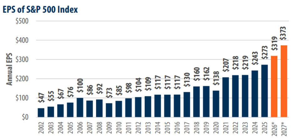 The long‑term EPS line rises from modest levels in the early 2000s, dips around major crises, and then falls sharply during the pandemic before snapping back to new highs in the mid‑2020s. Recent and projected figures climb from the mid‑200s into the low‑300s and then the high‑300s over two years, implying back‑to‑back growth rates in the high teens—among the steepest slopes on the chart. This visual captures how earnings not only recovered but are expected to push into an unusually strong expansion.