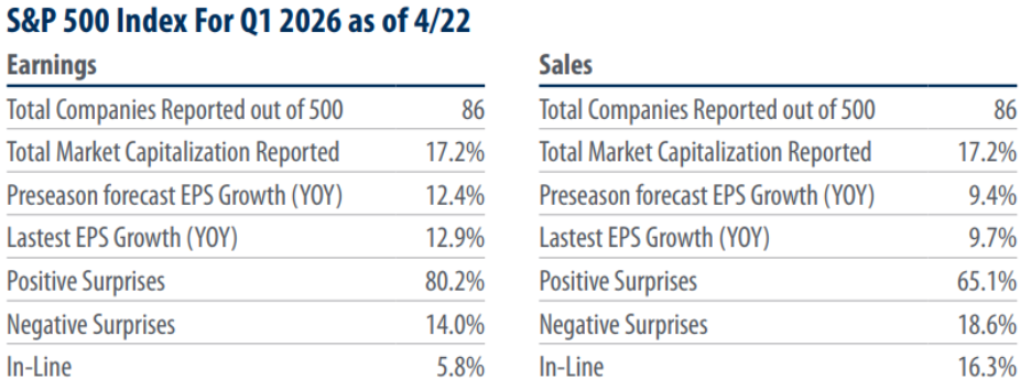 Finally, the early season earnings table for the first quarter of 2026 offers a real‑time check on these themes. With only 86 companies reporting as of 4/22, representing just over 17% of the index’s value, earnings growth of 12.9% is already slightly ahead of preseason expectations, and nearly four‑fifths of results are positive surprises, with similar outperformance in revenue. Even at this early stage, actual numbers are aligning with—and modestly surpassing—the robust growth trajectory implied by the charts. Next week should provide much more evidence, as the Mag-7 stocks (Nvidia, Apple, Microsoft, etc) all report next week, and they make up approximately one-third of the index.