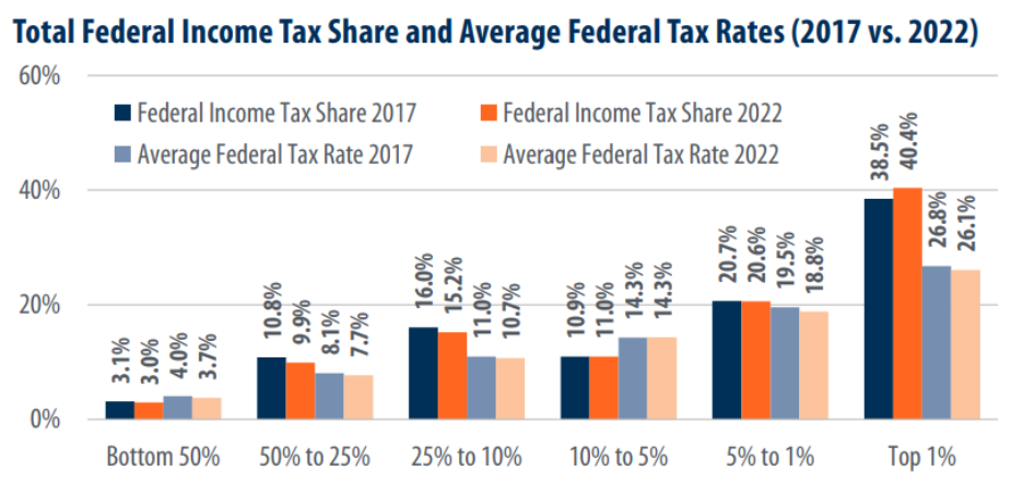 IRS data from 2022 indicates that the top 1% of taxpayers—those earning $663,164 or more—paid an average federal income tax rate of 26.1%, while the bottom 50%—those earning $50,339 or less—paid an average rate of only 3.7%. This means the highest earners pay a rate more than seven times higher than that of the bottom half, as shown in the first chart below. Moreover, the 2017 Tax Cuts and Jobs Act (TCJA) did not solely benefit the wealthy; in reality, average tax rates declined for nearly all income groups between 2017 and 2022, with the exception of the 10th–5th percentile bracket, which remained at 14.3%, as the second chart illustrates. Notably, the share of federal taxes paid by the top 1% increased from 38.5% to 40.4%, while the bottom 50% saw their share decrease slightly from 3.1% to 3.0% in the same period.