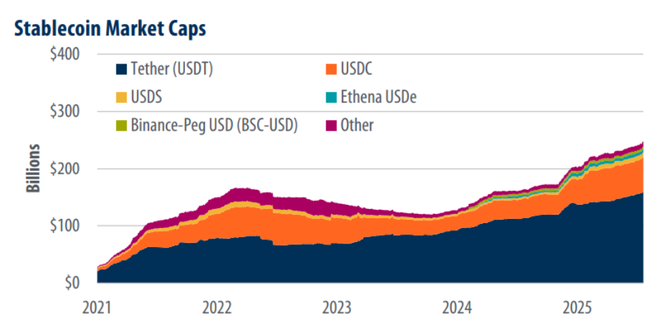 Over the past several years, stablecoins have grown at a remarkable pace. From virtually nonexistent a few years ago, the market has surged to an impressive $250 billion valuation. Two major players dominate the space, with Tether (USDT) and USD Coin (USDC) collectively accounting for over 90% of all stablecoin activity, as shown in the first chart below. Most of these are backed directly by fiat currency, providing users and institutions confidence in their value. This concentration is indicative of trust in these issuers and the perceived stability and reliability of their reserves.