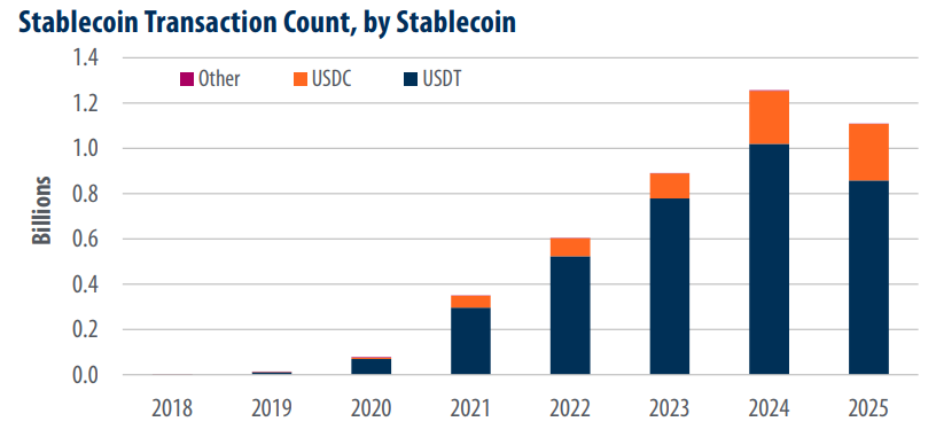 The practical uses of stablecoins are rapidly expanding, having already reached a significant milestone: in just the first seven months of 2025, stablecoins facilitated more than one billion transactions—nearly matching the total activity from all of the previous year, as the next chart highlights. This heavy usage underscores their growing importance as a payment tool, especially for cross-border transactions. Stablecoins have several distinct advantages over traditional international payments, including the ability to operate at any time, lower transaction costs, and instant settlement. Their reliance on blockchain technology also means heightened transparency and traceability for users and regulators alike.