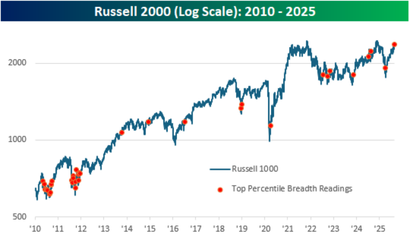Last Friday, the Russell 2000, the widely followed U.S. small-cap index, saw an impressive performance with 96% of the stocks represented in the index finishing the day higher. When a vast majority of constituents in a small-cap index rise concurrently in a single session, it typically represents an unusual surge in positive market breadth. Such events stand out historically as rare occurrences, often clustering around periods of heightened market activity or recovery phases. The first chart illustrates the performance of the Russell 2000 on a log scale since 2010, with red dots marking each day when the index's breadth reading was in the 99th percentile or higher.