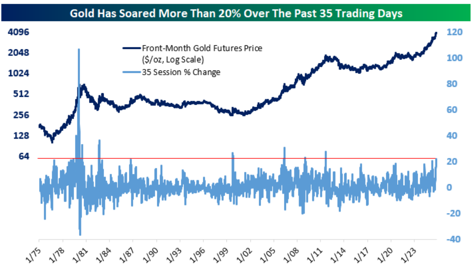 Gold has recently demonstrated notable price momentum in global markets, reinforcing its reputation as a commodity prone to dramatic swings and investor enthusiasm. Gold has had an incredible run with futures extending their price above $4,000/oz today after breaching that level for the first time Wednesday to an all-time high. The following chart from Wednesday illustrates that prices were up more than 20% over the last 35 trading days since August 19. That's one of the strongest runs in history, albeit falling short of several different surges between 1975 and 2011. Overall, this is the fourteenth time that gold has risen at least 20% in that time span without having done so in the prior three months.