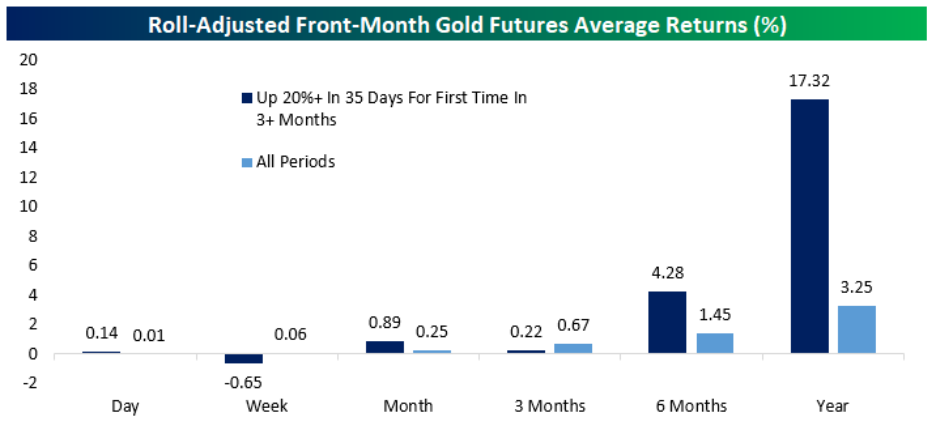 This recent move in gold prices underscores a core characteristic: the market’s sensitivity to momentum effects, which have been observable across decades. When gold surges, it is not uncommon to see short-term retrenchments, as traders and investors take profits after rapid advances. However, historical data suggests that while the initial phase after a spike may see some gains given up, longer-term performance frequently outpaces less-volatile periods, especially at the six-month and one-year marks. The next chart shows roll-adjusted front-month gold futures average returns, which are widely used in performance analysis and benchmarking of commodities, as they allow investors and analysts to measure price movements over time without interruption due to expiration cycles. As we can see, during periods where the front-month gold future prices are up 20% or more over 35 days, six-month and one-year forward returns have far outpaced all periods with returns of 4.28% and 17.32% respectively compared to all periods of just 1.45% and 3.25%.