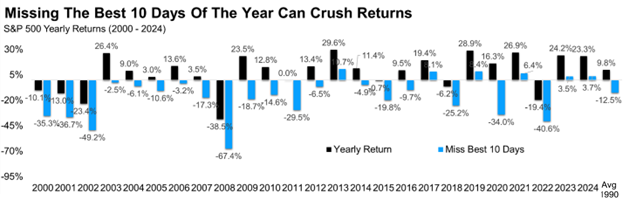 One of the most striking charts below quantifies the penalty for missing the best 10 market days within a year. The chart highlights the returns (black bars) from 2000 to 2024, as well as the returns by year when missing the 10 best performing days (blue bars). The chart also shows the average yearly return of the S&P 500 since 1990 at just under 10%. However, if an investor missed the top 10 positive days per year, the return would plummet to about -12.7%. This serves as a powerful reminder to not time the market but rather to maintain consistent investment discipline through volatile periods.