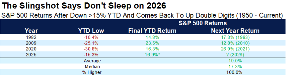 Finally, 2025 is positioned as a potential "slingshot" year, where despite falling over 15% during the year, it still closed with double-digit gains. Historically, years like 1982, 2009, and 2020 that exhibited this pattern were followed by strong gains in the subsequent year, around 19% on average. This offers a bullish outlook for 2026, illustrating how volatility and corrections can set the stage for future momentum.