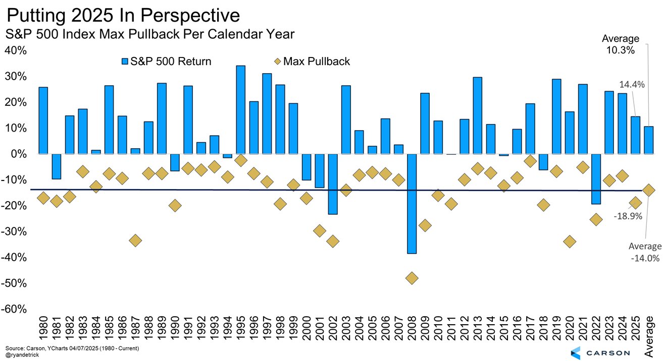 The year 2025 is illustrated as a hallmark example of market volatility, paralleling numerous years since 1980 that experienced both strong gains and significant corrections. Notably, 2025 saw a near bear market around the Liberation Day crash in April, yet the year still showed potential for solid overall gains. This pattern affirms a recurring theme: good years often include bad days. The chart below illustrates that since 1980, average yearly stock market gains have been double digits, despite average peak-to-trough declines of around 14%. This highlights that corrections of 12-15% are normal and should be expected.