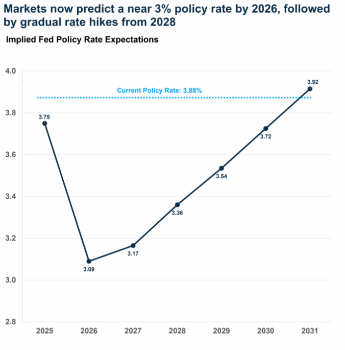 Central banks cutting policy rates—or signaling dovish intent—directly eases financial conditions. Lower rates drive down the cost of capital, spur cyclical sectors, support higher asset valuations, and foster positive sentiment in equity markets. The expectation of accommodative monetary policy frequently ignites rallies and supports sustained periods of market gains. The following chart shows that the futures markets are predicting the U.S. Fed policy rate to drop from a current rate of 3.88% to as low as 3.09% by early next year, providing a near-term boost.