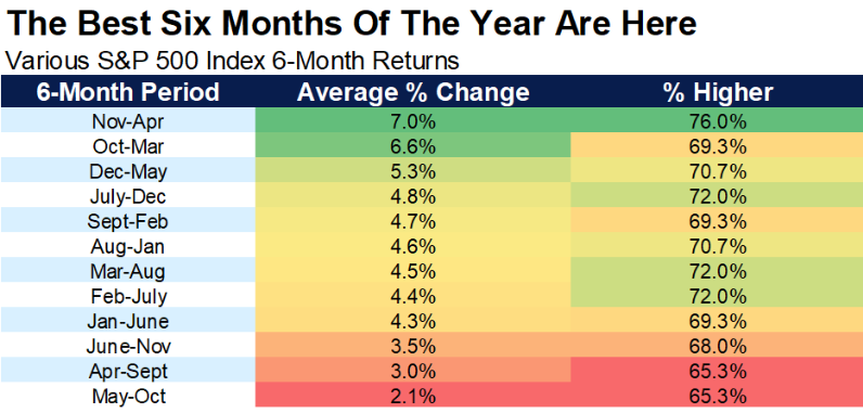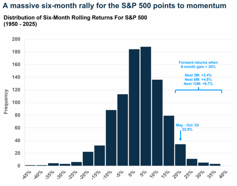 As we can see in the first chart below observing historical six-month performance data for the S&P 500 Index, the November to April timeframe has consistently provided the strongest returns, with both the highest average percentage gain and likelihood of positive outcomes. The second chart illustrates six-month rolling returns for the S&P 500 index over several decades. Most returns cluster around the 0% to 10% range, highlighting a typical positive but modest outcome, while extreme negative and positive returns are much less frequent. Notably, when the index has rallied more than 20% over six months—as has occurred recently, see chart notes in light blue—historical patterns suggest continued strong performance over the following months, pointing to underlying momentum in the equity market.
