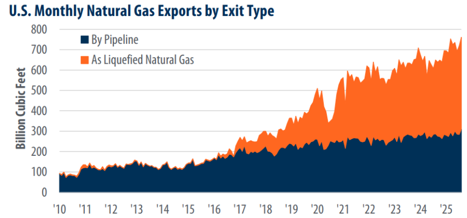 Exports via pipeline have grown more modestly, with shipments to Canada increasing 1% and those to Mexico rising 3.5% over the past year. Notably, U.S. exports to Mexico are forecasted to grow by nearly 40%, from 6.5 Bcf/d to 9 Bcf/d by 2030. Monthly LNG exports hit consecutive all-time highs in August and September 2025, climbing to 14.8 Bcf/d and 15.1 Bcf/d, respectively—up 8.6% and 11% from the previous highs set in December 2023.