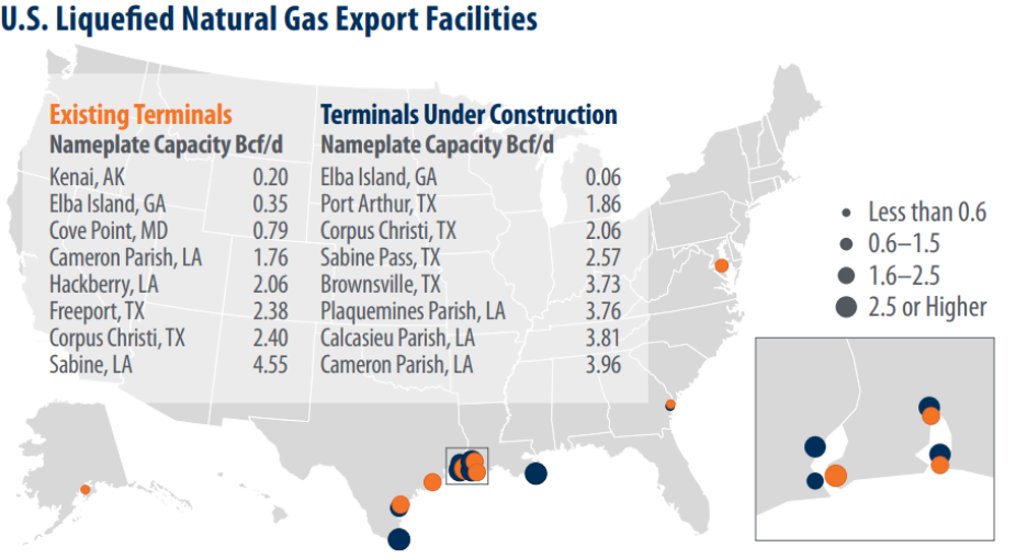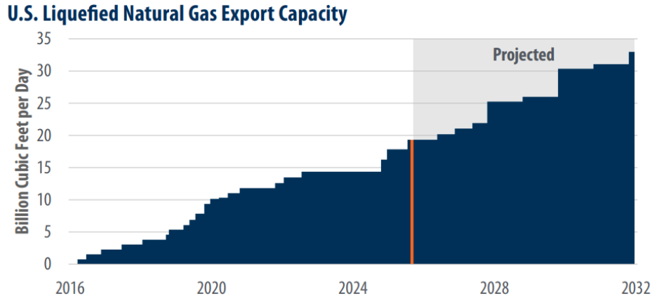 The U.S. currently operates eight major LNG export terminals, mainly clustered along the Gulf Coast in Texas and Louisiana, as the following infographic illustrates. Eight additional terminals are under construction, expected to gradually come online through 2032. Another ten projects have received federal approval but have not yet started construction. Presently, total LNG export capacity stands at about 19.3 Bcf/d. The second charts shows that ongoing investment is slated to add 13.6 Bcf/d of new capacity, which will boost total export potential close to 33 Bcf/d by 2032.