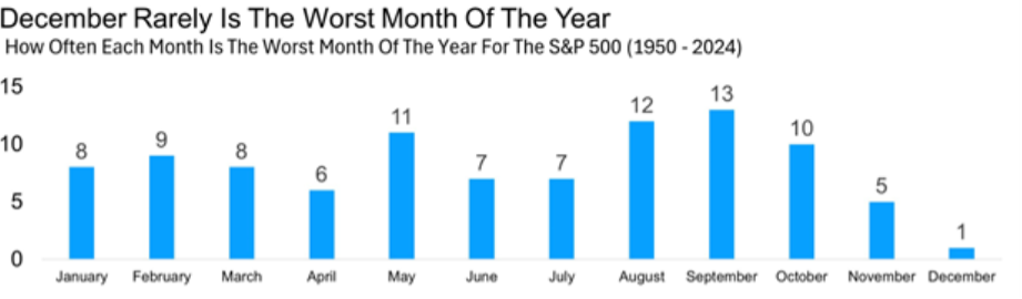 Long-term data shows that December has posted positive returns more often than most other months, reinforcing its reputation as a supportive period for risk assets. However, the month stands out less for spectacular upside and more for its relatively low frequency of being the worst month of the year, as shown in the chart below, implying a bias toward stability rather than extremes.