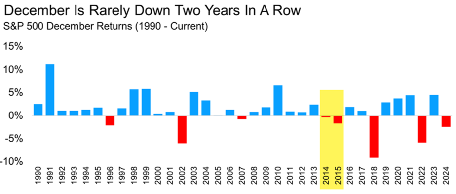 Recent history adds an important nuance: over the past decade, December’s average performance has been more muted, reminding investors that seasonality is a tendency rather than a sure thing. Even so, back-to-back negative Decembers have been very uncommon, as the next chart shows, which keeps the statistical odds tilted away from another weak outcome following a down December last year.