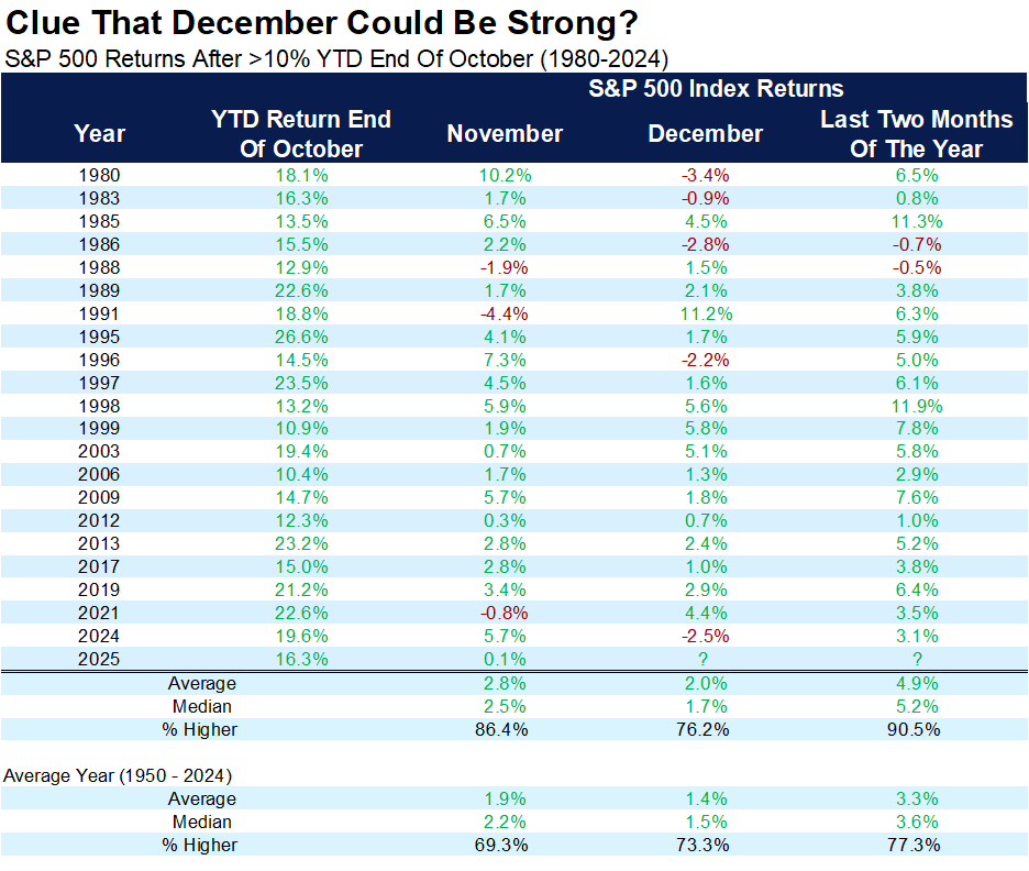 Another recurring late-year dynamic is performance chasing, especially when the first ten months of the year have delivered double-digit gains. In such environments, market history shows that the final two months have frequently added to earlier strength as investors and allocators attempt to close performance gaps and fully participate in the prevailing trend. As we can see in the chart below, after such an occurrence, average returns were 4.9% for the last two months of the year compared to the all year average (since 1950) of just 3.3%.