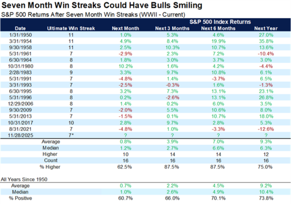 This chase effect can be amplified when the index has already strung together multiple consecutive positive months. Past episodes of extended monthly win streaks often saw further gains in the following months, indicating that momentum, once established on a multi-month horizon, tends to persist more often than it abruptly reverses, as shown in the following chart. As we can see, the shorter term forward returns (3-months and 6-months) significantly outperform the all-years average since 1950 before coming back in line with long-term averages when observing the next year’s forward returns.