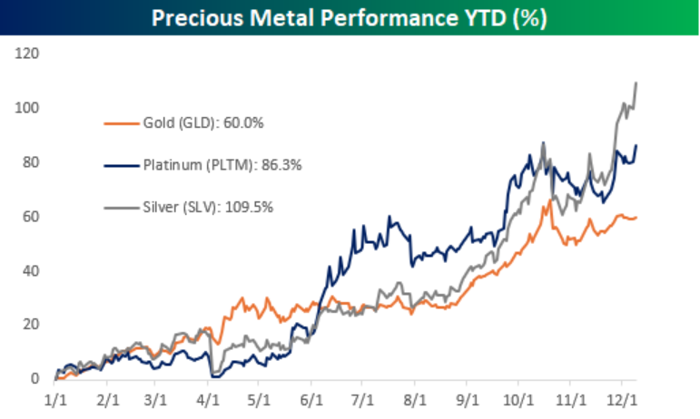 This year (as of Wednesday, December 10th), gold rose about 60%, platinum advanced roughly 86%, and silver surged by approximately 110% as this chart below highlights, putting these metals in the same conversation as the strongest individual stocks in major equity indices. Such moves compress extraordinary capital appreciation into a short window, challenging the notion that investors must always look to growth companies for outsized returns.