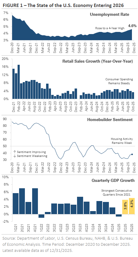 The stacked charts in Figure 1 over the next two pages provide an update on the U.S. economy using labor, consumer spending, and housing data released after the shutdown. The top chart shows labor market conditions continued to soften in Q4, with unemployment rising to a four-year high as hiring slowed. The second chart, which graphs the year-over-year growth rate of retail sales, highlights the consumer’s resilience. Consumer spending has cooled since 2022, but it remains steady despite affordability challenges and persistent inflation. The third chart graphs the homebuilder sentiment index, where readings above 50 signal positive sentiment. The index ticked higher in recent months, but it remains below 50, an indication that housing activity continues to run below the pre-pandemic trend. The bottom chart shows GDP growth rose to 4.3% in Q3, up from Q2’s 3.8%. Those are the strongest consecutive quarters of growth since 2021.