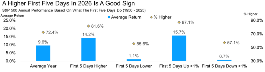 The first chart highlights the historical annual performance of the S&P 500 Index since 1950 based on the first five trading days. Years that begin on a positive note tend to deliver stronger and more frequent gains than the long-term average, and outcomes improve further when that early strength exceeds a 1% advance as it did this year. When the year starts up over 1% as it did this year (1.1%), it has gone on to produce an average annual return of almost 16% and positive 87% of the time. Against that backdrop, the fact that the new year started with a solid gain supports a constructive bias toward the full-year outlook, even while acknowledging that no single indicator can guarantee results.