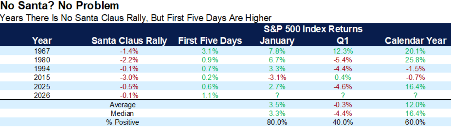 The following table breaks out years when the Santa Claus Rally was negative, but the first five days were positive like this year, and the resulting dispersion of January, first quarter, and full year outcomes underscores the nuance in these seasonal indicators. As we can observe, this combination has historically aligned with choppy or even weak first quarter performance on average, yet full year results have often recovered to deliver mid to high single-digit or double-digit gains, implying that investors who overreact to early year volatility risk missing the longer-term trend.