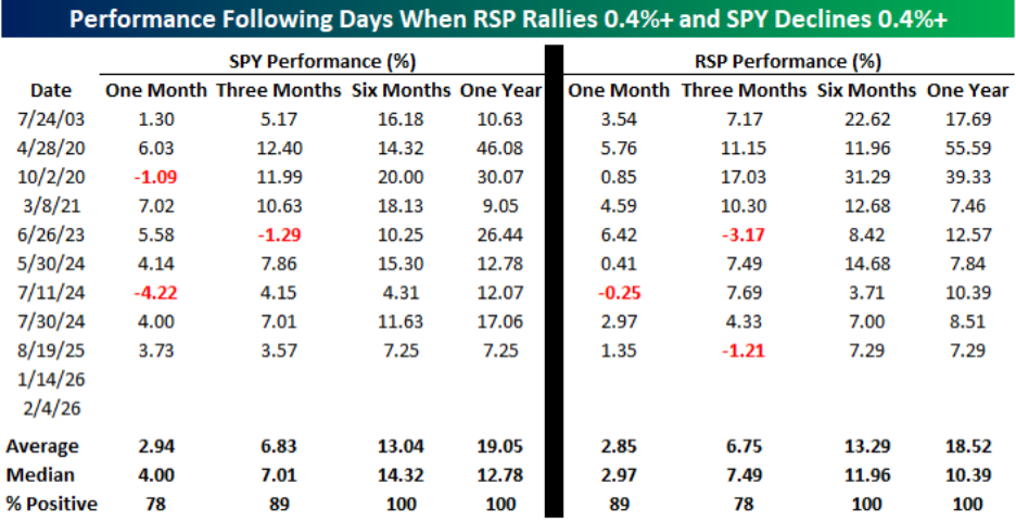 The below table, which demonstrates days when the equal‑weight large‑cap ETF (RSP) rallies while its market cap‑weighted counterpart (SPY) declines by more than 0.4% each, shows that these episodes are rare but historically constructive. Across nine prior instances, one‑year returns following such days are positive in every observation for both vehicles, with three‑month, six‑month, and twelve‑month hit rates all skewed strongly to the upside. Average and median outcomes at each horizon cluster firmly in positive territory, suggesting that what can feel like a “leadership crack” at the top of the index has more often coincided with durable strength beneath the surface rather than with imminent broad deterioration.