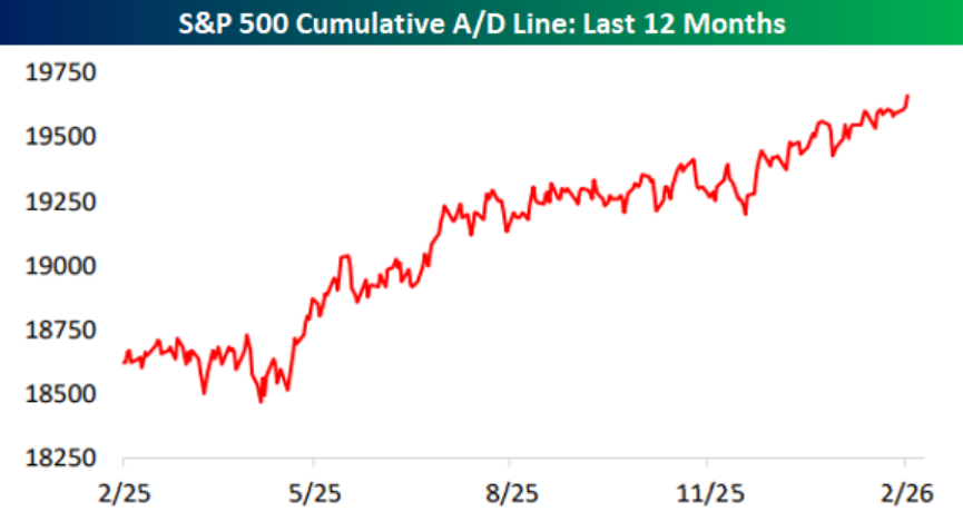 That interpretation is reinforced by the chart of the S&P 500’s cumulative advance/decline line over the past year, which has pushed to new highs even as some heavily weighted constituents have come under pressure. A rising A/D line making fresh highs indicates that more stocks are advancing than declining over time, a textbook sign of robust breadth supporting the rally. When the breadth line leads or confirms price, it typically reflects participation that is broadening rather than narrowing, weakening the case for the notion that a handful of mega‑caps are solely propping up the market.