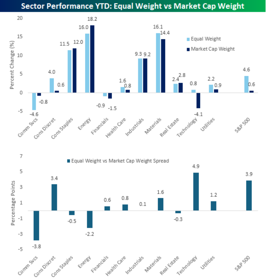 The sector‑level bar chart below comparing year‑to‑date returns for equal‑weight and market cap‑weight constructions deepen this picture of broad participation. In seven sectors, the equal‑weight variant is ahead of the market‑cap version this year, with particularly notable relative gains in Technology and Consumer Discretionary, where the equal‑weight lines sit several percentage points above their cap‑weighted peers. While Communication Services and Energy show the opposite—cap‑weighted versions outperforming—the aggregate spread bar for the overall index still favors equal weight, underscoring that performance is not being driven exclusively by the largest names.