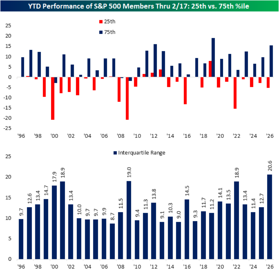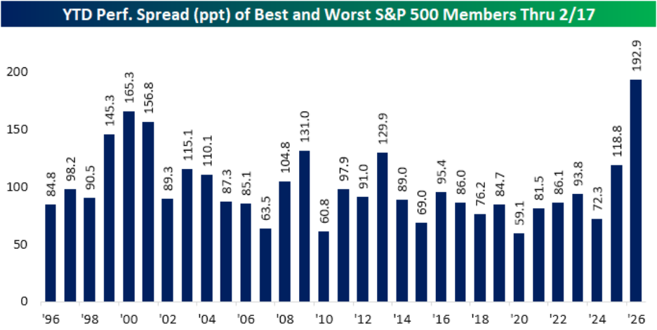 The first chart today, showing the share of index members moving more than 20% year-to-date (Feb. 17, 2026) versus those barely budging, underscores how unusually large the underlying swings have been. A substantial proportion of stocks have already experienced out-sized gains or losses, while the cohort with muted price moves has shrunk to one of the smallest numbers in decades, highlighting how pervasive stock-level volatility has become. Historically, similar spikes in the fraction of big movers have coincided with periods of regime change, stress, or early-cycle recovery, when investors aggressively reprice fundamentals and narratives across sectors.