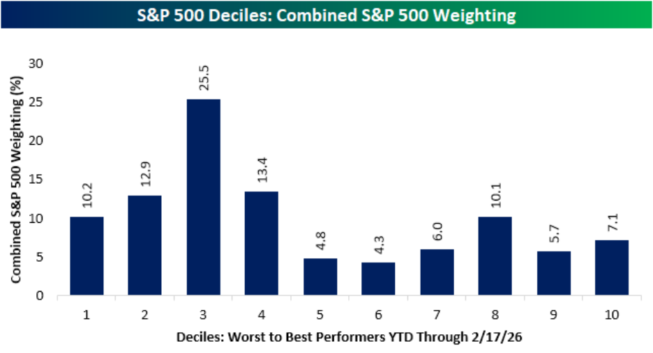 Finally, the decile chart linking performance buckets to revenue growth reveals an important nuance: the pain is concentrated where the capital is. The weakest performance deciles represent a disproportionately large share of index market capitalization and are heavily populated by high-growth businesses, while both the worst and the best deciles exhibit double-digit revenue growth. That juxtaposition implies that the market is actively repricing growth—distinguishing between expensive, crowded growth that disappoints and growth that is either underappreciated or better-supported by fundamentals. For diversified investors, this environment has quietly been rewarding breadth and balance, even as those concentrated in the largest, highest-growth names may experience a very different—and far more painful—version of “flat” index performance.