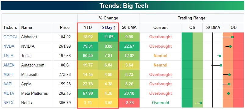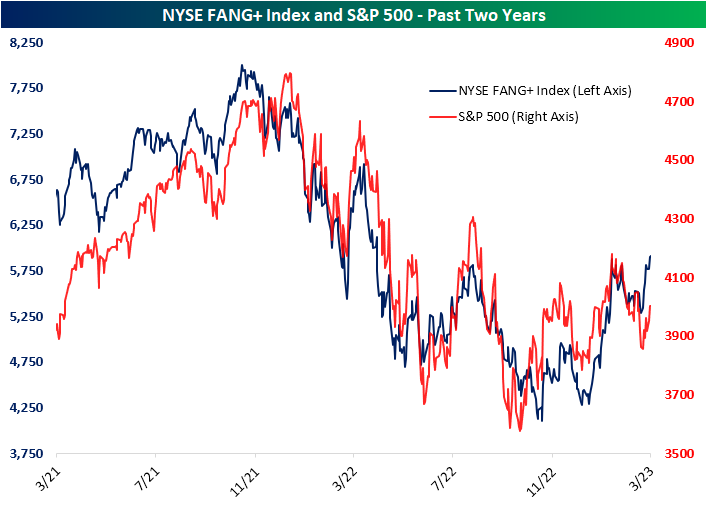 Big Tech significantly underperformed the S&P 500 last year, leading headlines with heavy layoffs in an attempt to control costs, however, the past three months have been different. In a refreshing change of pace, Big Tech has seen a substantial rally as can be seen in the table below with extremely strong YTD returns and most in overbought territory. To provide some context, the overall S&P Technology Select Sector Total Return Index is up 17.3% YTD as of yesterday, whereas the S&P 500 Total Return Index is only up 3.3%, after the S&P Tech sector underperformed the S&P 500 last year by about 10%. However, many tech names performed much worse than that as the NASDAQ underperformed the S&P 500 by 15% last year.