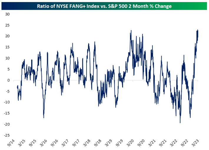 Things turn more positive for Big Tech when we observe the charts below, one showing a comparison between the NYSE FANG+ Index and the S&P 500 Index over the last two years and one showing the ratio of their 2-month rates of change. The NYSE FANG+ index tracks ten of the largest and most highly traded Tech and Tech-related companies. Currently, the NYSE FANG+ is trading its highest level since April 2022, while the S&P 500, as of Wednesday, was still trading 4% below its most recent February 2023 high and still well below its August 2022 high. As the second chart illustrates, the 2-month rate of change for the S&P Tech sector relative to the S&P 500 is at its highest rate since 2014.