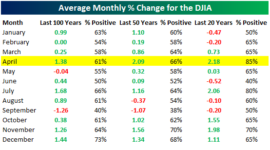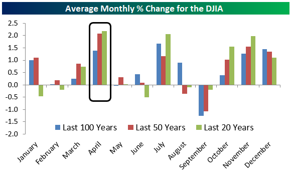 Looking specifically at the month of April, it’s not only the S&P 500 Index that has benefited, as we can observe historical April returns for the Dow Jones Industrial Average (DJIA) in the tables below. Over the last 20 and 50 years, April has been the strongest month for stocks, with 20-year average returns of 2.18% and 50-year average returns of 2.09%. When observing the past 100 years, only December and July have been stronger than April returns. These are impressive numbers, especially when considering that April returns for the DJIA over the last 20, 50 and 100 years were positive 85%, 66% and 61% of the time, respectively.