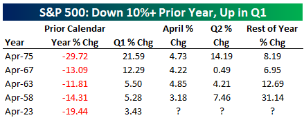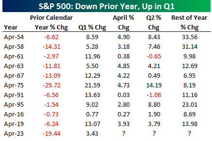 Only four prior instances may seem fairly limited to use as a reliable indicator; however, when we observe occurrences where the S&P 500 was down by any amount in the prior year and then posted positive gains in the current year’s first quarter, we can expand the data points to 10 prior instances. In every case, April posted positive returns. Only two times have resulted in negative returns for the second quarter (and those were small), but even more impressive is that 100% of the prior instances resulted in strong positive returns for the rest of the year (April to December). Time will tell if 2023 can maintain this trend.