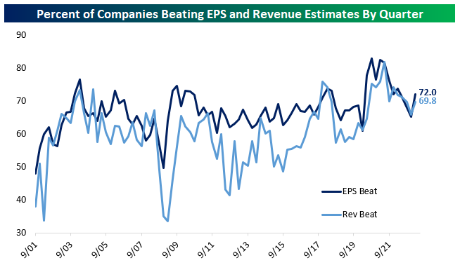 We are currently just over a month into this quarter’s earnings season reports, and so far, the results have been relatively positive, especially when comparing to previous seasons. As of Wednesday, May 3rd, 937 companies had reported earnings in the U.S., and when we compare this quarter to previous reports, we can see a positive trend forming. As represented in the chart below, the beat rate for announcements this quarter is running at 72.0% for earnings per share (EPS) versus 65.3% last quarter, which is in the 80th percentile since 2001. Revenue beat rates are also up, 69.8% versus 65.9% last quarter; that rate is in the 84th percentile of prior periods for this cohort of companies. The improvement breaks a string of weakening results versus expectations dating back to the height of the Covid-19 pandemic during 2020-2021.