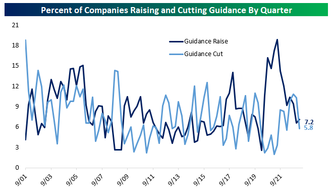 In addition to improving earnings, we can see a rise in net positive guidance by companies which breaks a string of three consecutive quarters of companies cutting guidance. Company guidance refers to projections made by a company to its shareholders about upcoming earnings details for the next quarter or year. The chart below shows the net guidance raise and cut by companies in the U.S. and, although 7.2% net may seem like a relatively small number of companies, the change in trend is certainly welcome news for investors.