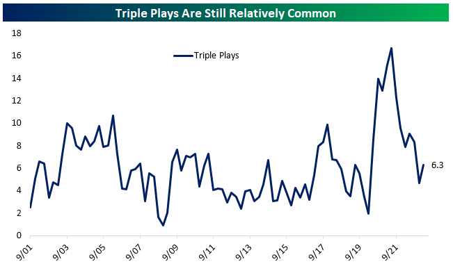 Perhaps more impressive, as the next chart illustrates, we also note that with guidance raises higher quarter-over-quarter and an improvement in the EPS beat rate, we're seeing more “Triple Plays” this quarter. Triple Plays, as termed by the astute Bespoke Investment Group, refer to companies that report a beat on EPS, a beat on revenues, and raised guidance, which are a rare occurrence for corporations and typically show favourable strength. There are significantly fewer Triple Plays this quarter compared to the post-pandemic boom, but at 6.3%, the Triple Play rate is still above the historical median and increased from last quarter.
