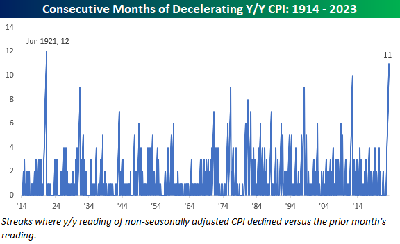 In 2022, inflation was the most discussed economic issue and rightfully so. We have painfully witnessed its impact on economic growth and corporate earnings growth. However, in our quarterly commentary and weekly comments in the third quarter of last year, as well as discussions with clients, we were adamant that we felt we hit peak inflation mid-last year. We also noted that while economic and corporate earnings growth numbers may be worse in 2023, it doesn’t mean the stock market will be, as the market itself is a long leading indicator. In our second quarter commentary we showed that long-term inflation break-evens were already trending down, and rather quickly. Many of our other leading indicators were pointing to inflation declining significantly in 2023. This was one key reason for Milestone bearing a more optimistic, albeit cautious, view for risk assets this year. This forecast has turned out to be mostly correct as we will illustrate in our charts this week. The latest May CPI numbers for the U.S. just hit the tape, and it showed that year-over-year headline CPI (which includes food/energy) is now just 4.0%. This is still relatively high from what we are used to the last 10 years (excluding last year), but much lower than the 9.1% peak (highest since early 1980s) of June last year. However, we have now seen U.S. CPI decline for the 11th straight month, which is the longest consecutive month decline since 1921! The decline itself is not nearly as dramatic as it was after WWI and the Spanish Flu where it dropped from inflation of 23.7% to deflation of 15.8%, nor for some of the other streaks you see below, but the streak is still 11 months long at this point which is impressive and likely supportive of equities to some extent.