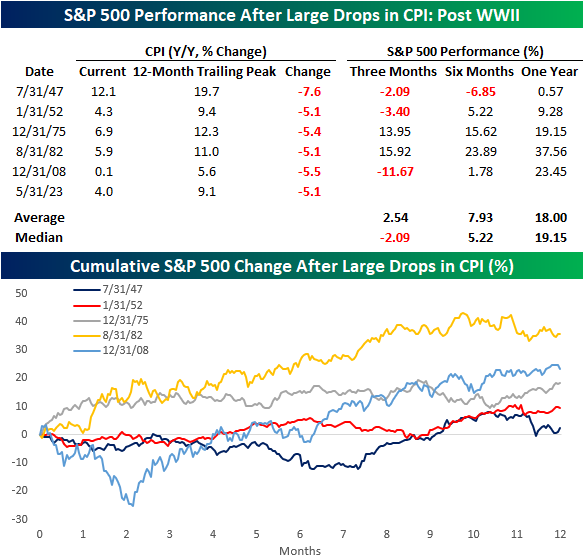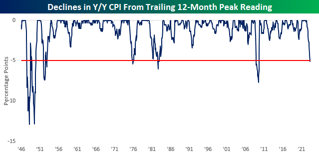 While the increase in inflation last year was extraordinary for recent times, the decline the past year has been just as remarkable. What goes up, must come down as they say. The 5.1% decline in headline CPI from its trailing 12-month high last June is the largest drop since the 2008 Financial Crisis. As the following charts show, for the entire post-WWII period, there has only been five other periods where inflation dropped more than 5% from a trailing 12-month peak.