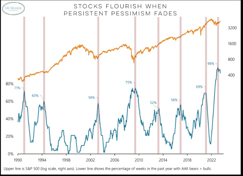 We will finish off this week’s comments with an interesting chart we came across today. As we have noted many times in our weekly comments over the past many months, there has been an extreme amount of pessimism out there. This is only natural after a very difficult market environment in 2022 due to recency bias. Last week we showed the dramatic shift from bearish to bullish views in the recent widely followed AAII Investor Sentiment Survey. In fact, we may be now coming out of the most protracted period of pessimism in the history of this survey. As the following chart illustrates, when persistent pessimism has faded in the past it has usually been great news for equities. The top orange line is the S&P 500 Index (log scale), and the bottom blue line shows the percentage of weeks in the past year where the AAII bearish sentiment has been greater than the bullish sentiment. We are coming off of a record 98% of the time, the largest since at least 1990. You can see in the shaded bars that in the past these periods of time have preceded lengthy bull markets, so one can only hope this time is no different.