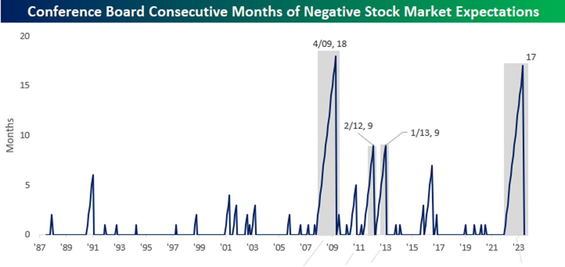 Since January 2022, the monthly report on investor confidence from The Conference Board in the U.S. has shown a larger percentage of investors expecting lower stock prices than higher. That all changed with the release of the latest June U.S. Consumer Confidence Survey, which ended the streak of net negative investor sentiment readings at 17 months. This is the second longest streak behind the 18 months experienced during and coming out of the 2008 Financial Crisis. In fact, since 1987, there have only been three other periods where the net readings on the part of investors were negative for nine months or more as we can see below.