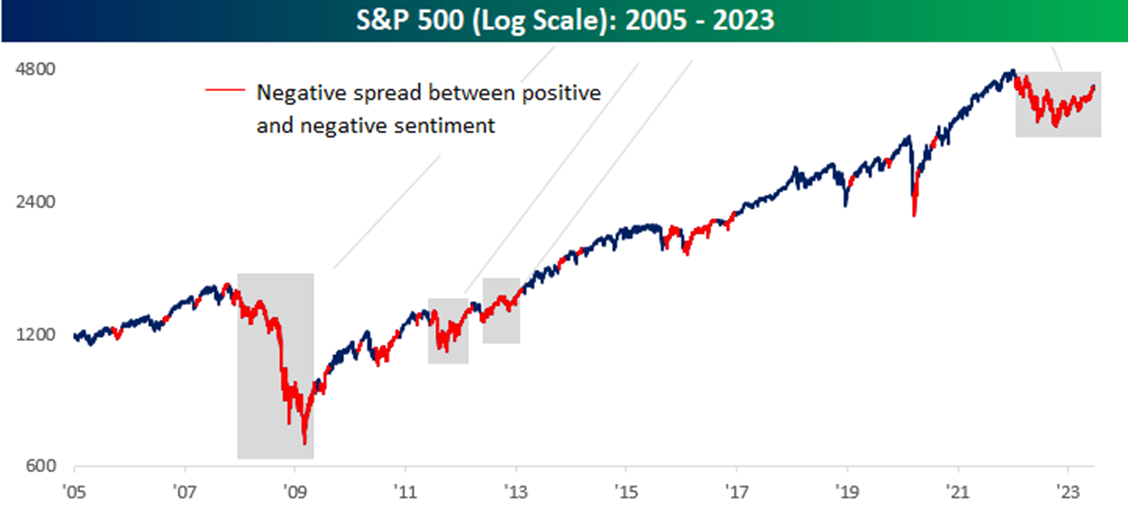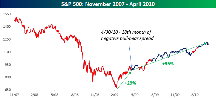 The next chart of the S&P 500 Index illustrates every period where there was a negative spread between bullish and bearish sentiment in red, and the three streaks of nine or more months are shaded in gray. In the year after each of the two nine-month streaks, the S&P 500 rallied 10.9% and 19.0%, respectively, and coming out of the record 18-month streak, the S&P 500 rallied even more.