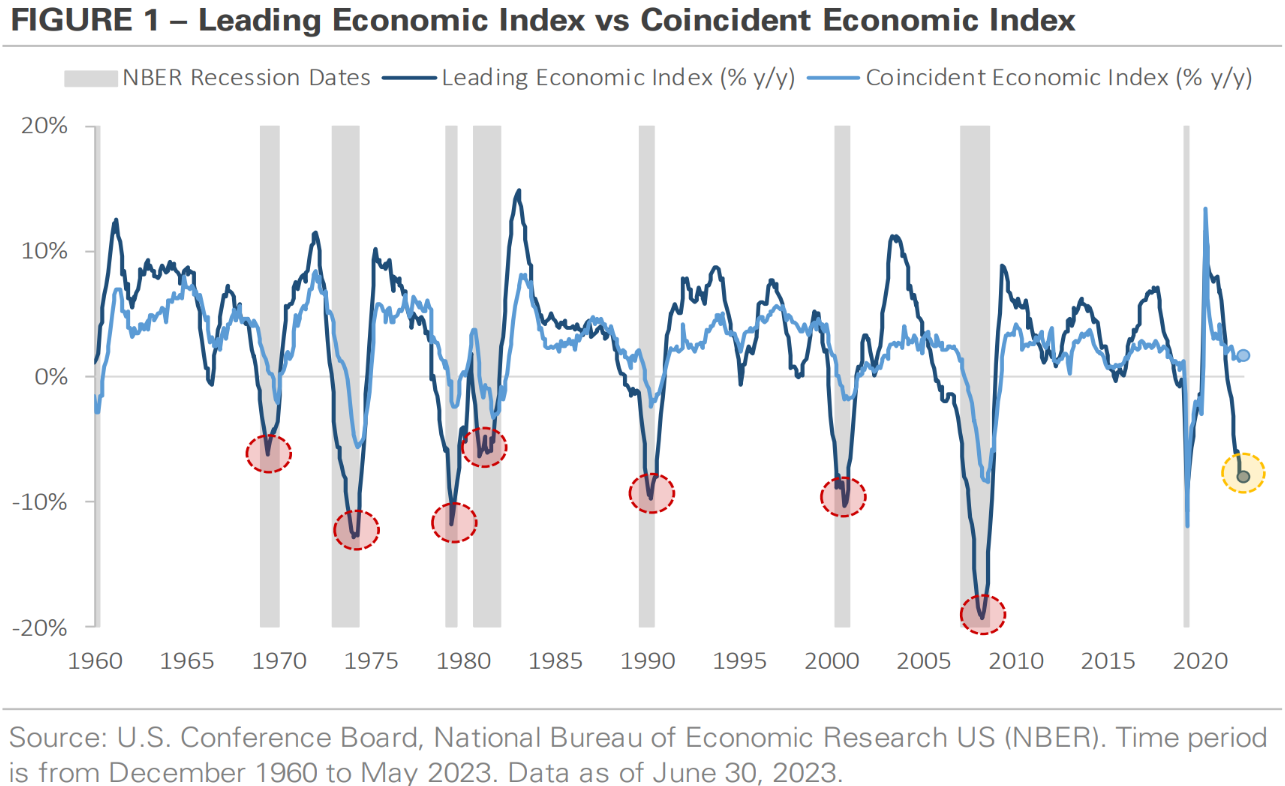 The chart shows that the LEI declined -8% during the past 12 months, an indication the economy may be approaching a turning point as the Fed’s interest rate hikes take effect. In contrast, the CEI rose +2% over the same period, an indication the economy currently remains strong. What does the LEI/CEI divergence imply? Positive CEI doesn’t necessarily mean the economy has avoided a recession, but CEI’s rise does provide additional evidence showing the U.S. economy’s resilience despite higher interest rates. On a related note, the chart shows that it’s not uncommon for the LEI to decline even as the CEI remains positive. The red circles highlight prior instances like today, where LEI declined first and then CEI declined later. However, the gray shades show that the U.S. economy has been near the start of a recession each time the LEI fell by more than -5% in 12 months.