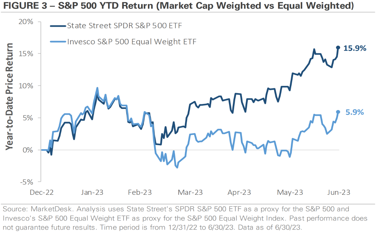 However, the market cap and equal weight versions of the S&P 500 diverged in March when the first signs of regional bank turmoil appeared. The S&P 500 traded higher in April and May, while the Equal Weight S&P 500 traded sideways. The split indicates that the biggest stocks drove a large portion of the S&P 500’s gain in Q2. The underlying equal weight index finished up 7% YTD total return (4.6% CAD). The 10% divergence between market and equal weight is one of the largest we have ever seen.