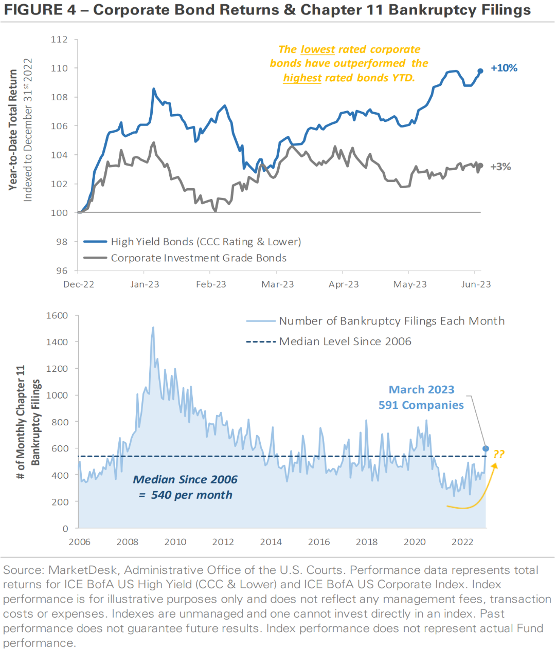 While rising interest rates caused bonds to trade lower, U.S. high yield corporate bonds traded higher in Q2 and produced a +0.7% total return. The top chart in Figure 4 takes the analysis a step further by comparing the return of CCC bonds, which are the lowest rated corporate bonds with a higher perceived risk of default, against a broad index of corporate investment grade bonds. The chart shows CCC-rated bonds generated a ~10% total return through June 30th, which includes both price appreciation and interest received. For comparison, investment grade bonds generated a ~3% total return over the same period. Why are the riskiest corporate bonds outperforming? They offer a higher yield as compensation for taking on more credit risk. An index of corporate investment grade bonds yielded 5.6% on June 30th, while an index of CCC bonds yielded 14.0%, almost 2.5x higher. The higher yield translates into more interest income, helping to boost total return.