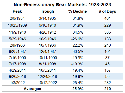 In the next table, we can observe a list of past non-recessionary bear markets which includes 11 instances since 1934. With non-recessionary conditions, bear markets tend to be less severe with an average drawdown in the S&P 500 of 25.9%, while the duration is also less pronounced with the average lasting 210 days. This is an important distinction to make when we observe what happened in 2022. Many economists were predicting a recession, inflation was running rampant, and a general sense of elevated fear dominated news headlines. However, the decline of 25.4% fell almost exactly in line with the non-recessionary bear market average of 25.9%, and the duration of 282 days was longer than the average number of 210 days but still much shorter than the average recessionary bear market. Interestingly, 2022 represented the third longest occurrence but just the sixth most severe drawdown out of the 11 total occurrences. That is not to say that a recession isn’t forthcoming coming at some point, but with 2022 in the rear-view mirror, there is now more evidence that this may have been a textbook non-recessionary bear market.